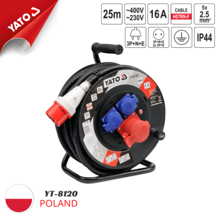 三相 + 二相電気コイル 25m YATO YT-8120 ポーランドは、溶接機、コンプレッサー、ポンプ、カッター、ドリル、照明機器、その他の電気機器などの電気機器に電力を供給するために建設現場や工場で広く使用されています。