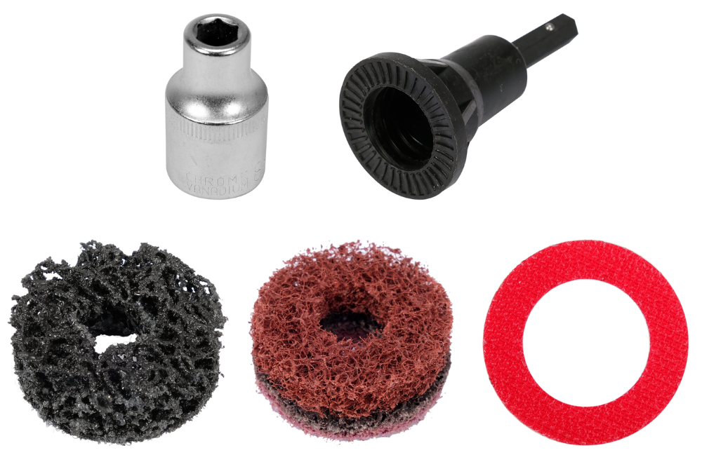 Set Includes: 10 replacement grinding discs, 2 Velcro adhesive pads, 1 guide pin, 1 adapter for 1/2 inch impact wrench