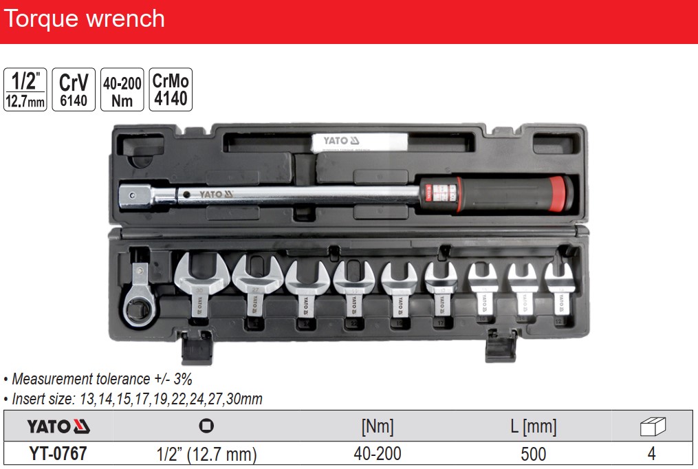 Các thông số kỹ thuật khác của Bộ cờ lê lực đầu cờ lê rời 1/2" 12 chi tiết 13-30mm Yato YT-0767: