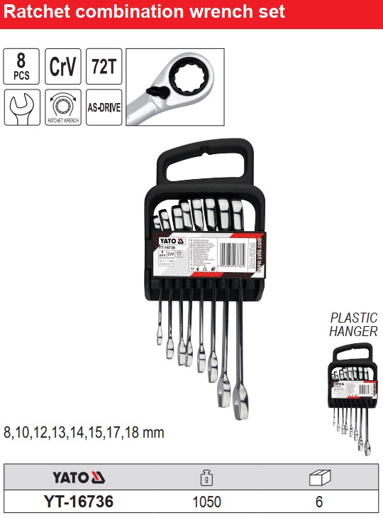bộ cờ lê đảo chiều yato, cờ lê đảo chiều 8-18mm, yato yt-16736, ratchet combination wrench set yato, cờ lê 72 răng