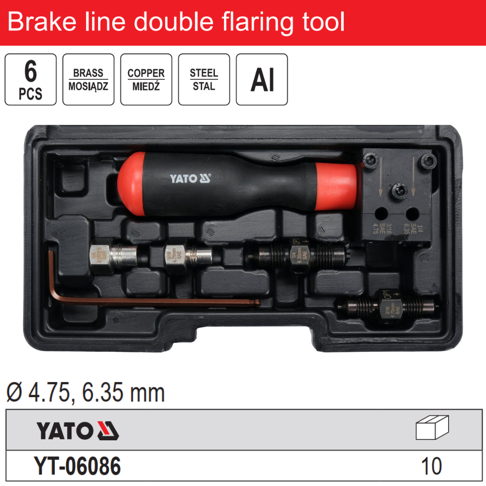 Bộ dụng cụ lã ống dầu phanh Yato YT-06086 được sử dụng để ép các loại ống phanh kim loại, bao gồm: