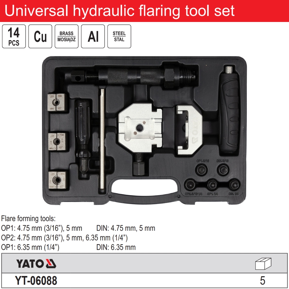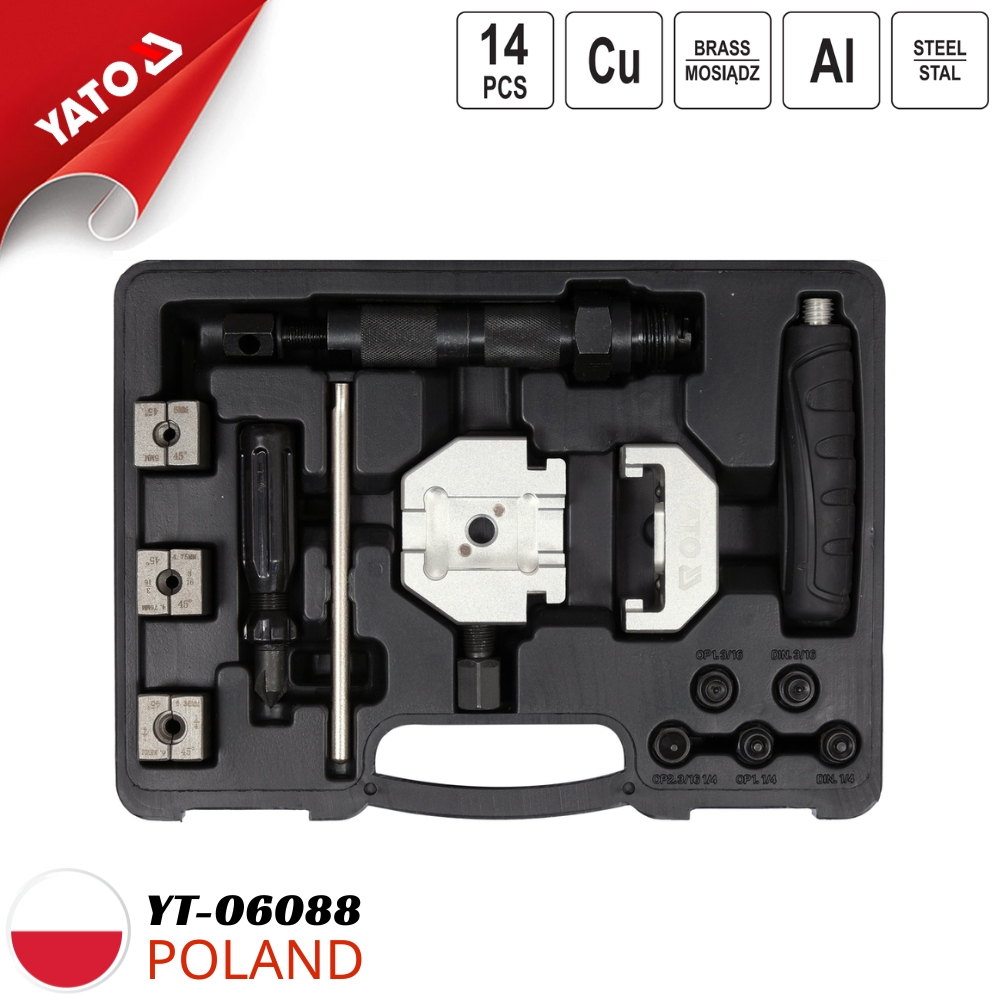 YATO YT-06088 là bộ dụng cụ loe ống thủy lực đa năng gồm 14 chi tiết, do Yato Tools Ba Lan phát triển, chuyên dùng để tạo đầu loe chính xác cho các loại ống phanh, ống thủy lực, ống đồng, đồng niken và thép. Đây là thiết bị không thể thiếu trong các gara ô tô, xưởng cơ khí, đơn vị thi công hệ thống phanh, điều hòa và sưởi ấm.