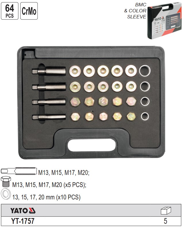 Thông số kỹ thuật của bộ taro ren và ốc xả dầu kèm ren cấy sửa ốc rốn dầu 114 chi tiết Yato YT-1757: