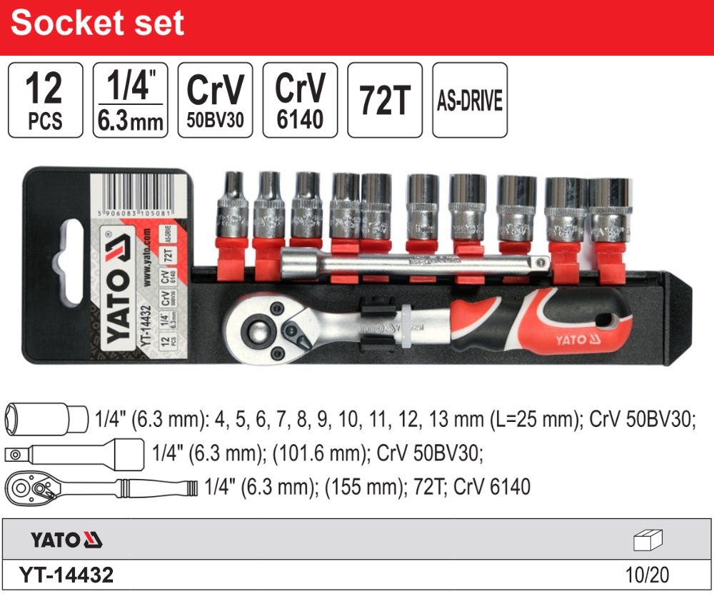 Thông số kỹ thuật của Bộ tuýp tay vặn 1/4" 4-13mm kèm thanh nối dài 12 chi tiết Yato YT-14432: