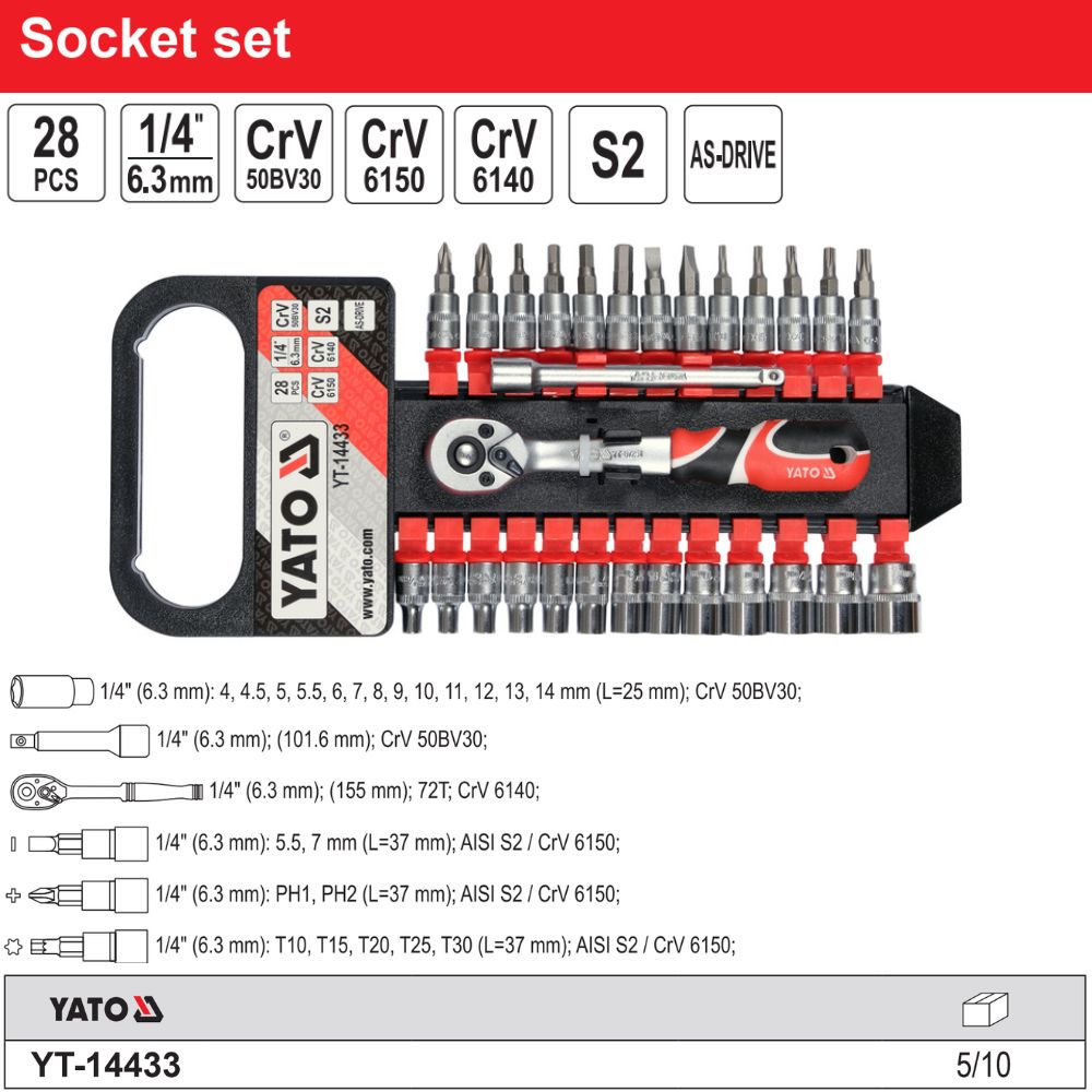 Thông số kỹ thuật của Bộ tuýp tay vặn và mũi vít tổng hợp 1/4" 28 chi tiết Yato YT-14433: