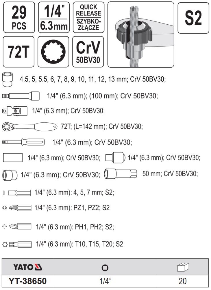 Thông số kỹ thuật của Bộ tuýp tay vặn xuyên tâm 1/4" 11 chi tiết Yato YT-38650: