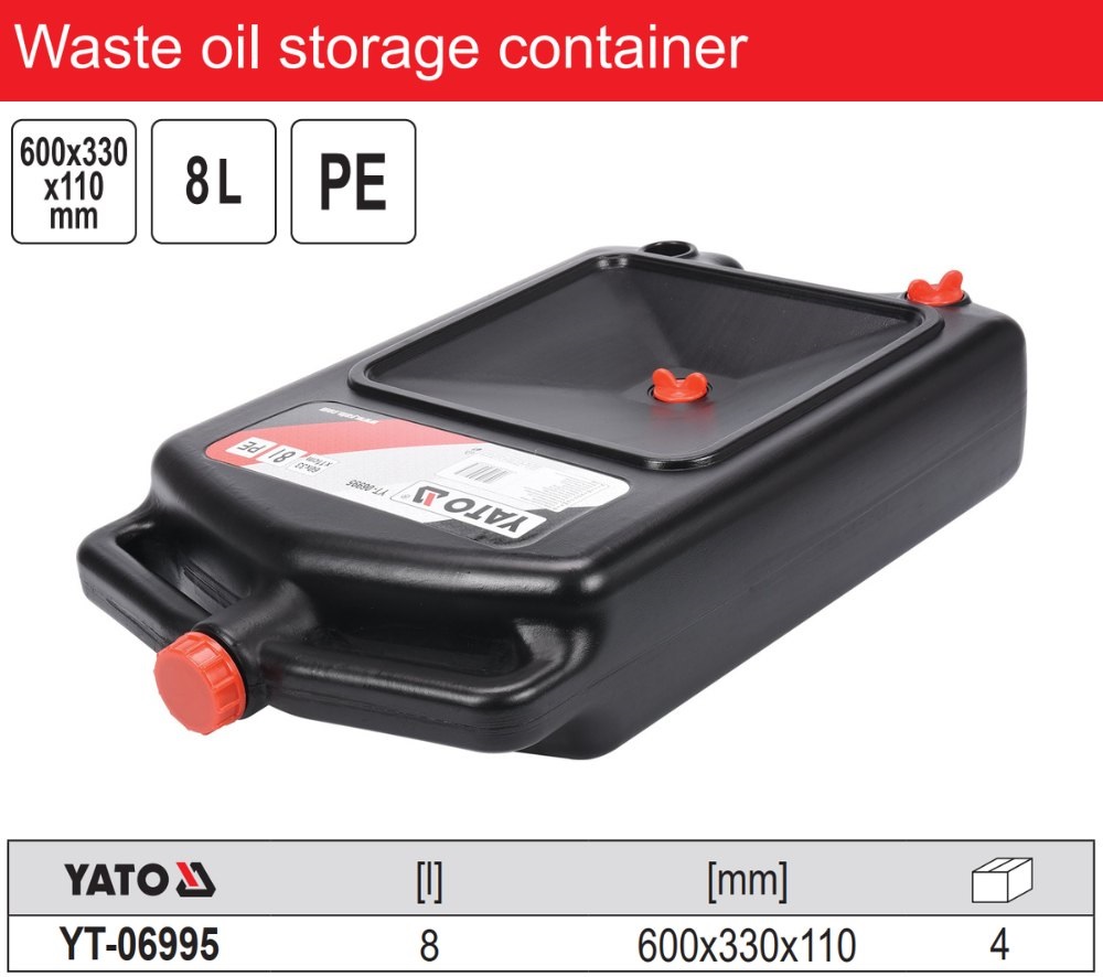 Thông số kỹ thuật của Can đựng nhớt thải 8L PE 600x330x110mm Yato YT-06995: