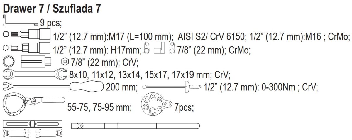 • Dụng cụ giữ và khóa bánh đà: 55–75 mm, 75–95 mm (7 pcs)