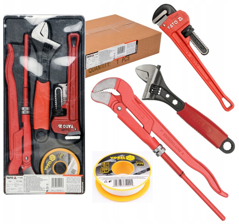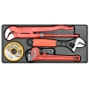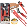 Bộ 4 món đầy đủ: gồm mỏ lết điều chỉnh (250mm), kìm nước kiểu S (1” / 25mm), kìm ống (10” / 250mm) và cuộn băng keo PTFE dài 15m giúp bịt kín ren.