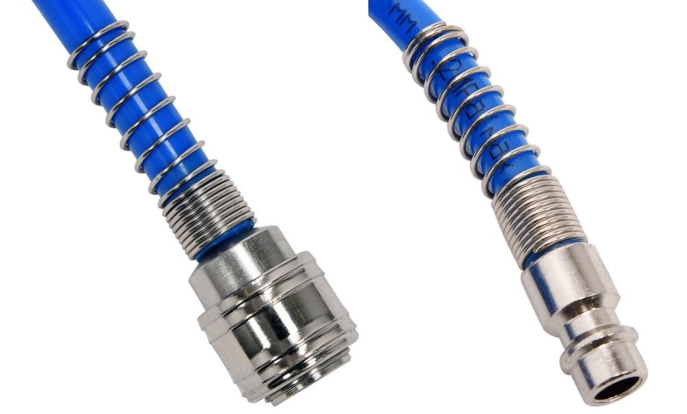 The hose operates based on the mechanism of delivering compressed air from the air compressor to the tool being used. The elastic PU spring allows the hose to stretch flexibly according to the user’s movements while keeping the pipe unobstructed, preventing kinks and maintaining stable air pressure throughout use.