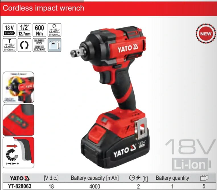 Súng xiết bu lông pin YATO YT-828063 được thiết kế để giải quyết hiệu quả các công việc tháo lắp bu lông với mô-men xoắn cao. Thiết bị sử dụng động cơ brushless kết hợp cơ cấu búa đập (impact), giúp tạo ra lực siết lên tới 600Nm, đủ mạnh để xử lý nhiều loại bu lông trong sửa chữa và lắp ráp.