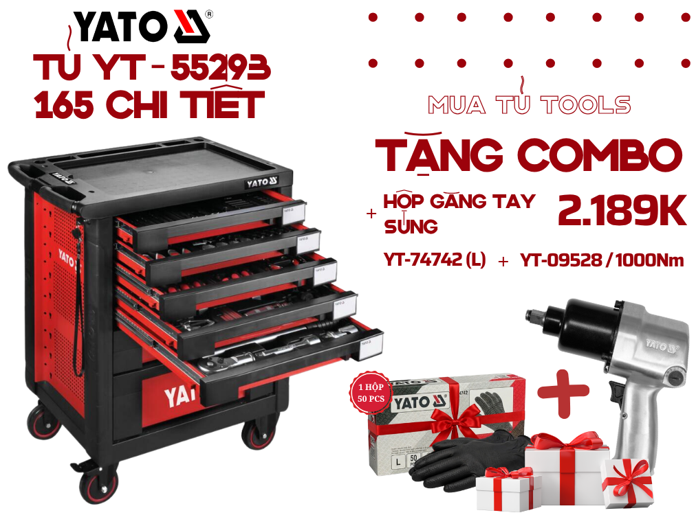 Khi sở hữu Tủ đồ nghề chuyên LỐP XE 165 món Yato YT-55293, quý khách sẽ được tặng ngay một combo quà tặng cao cấp gồm: