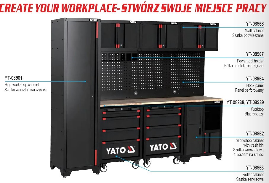 Được nghiên cứu và phát triển bởi Yato Tools – thương hiệu dụng cụ nổi tiếng đến từ Ba Lan, bộ tủ workshop này mang đến thiết kế module linh hoạt, độ bền cao và khả năng lưu trữ tối ưu, phù hợp cho gara ô tô, xưởng cơ khí và trung tâm bảo dưỡng chuyên nghiệp.