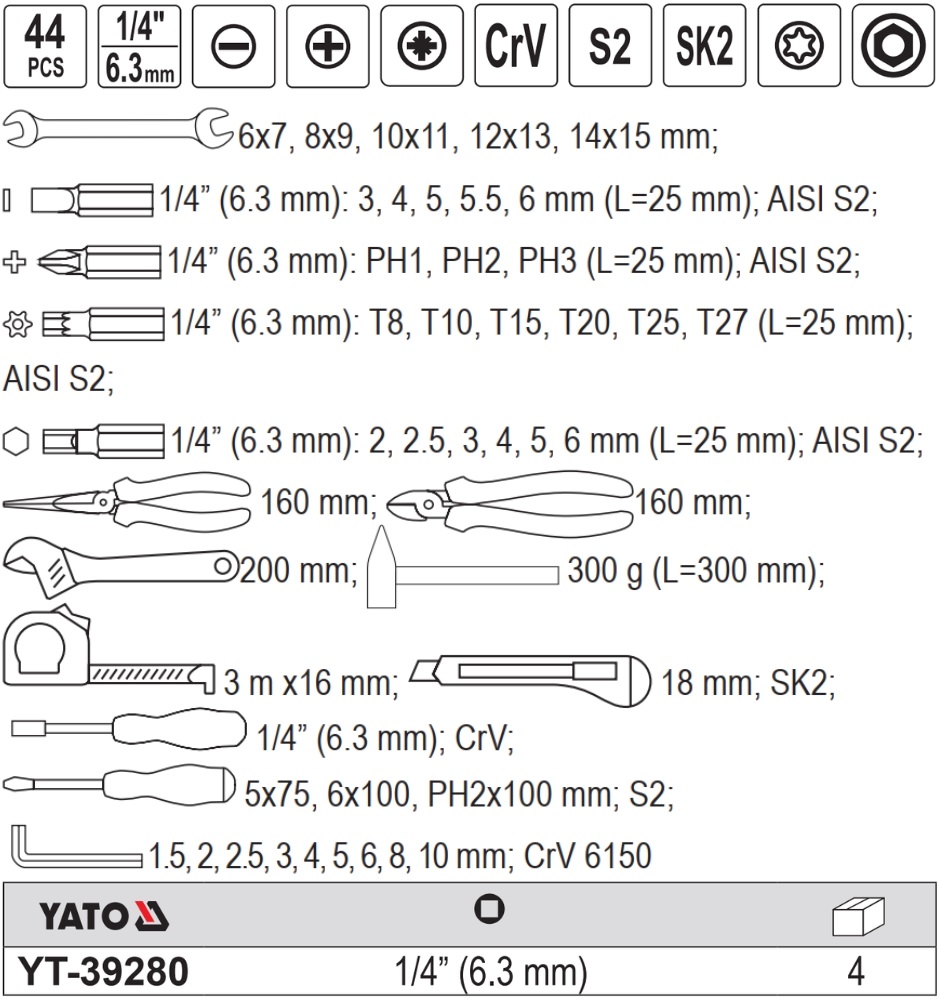 Túi dụng cụ sửa chữa tổng hợp Yato YT-39280 bao gồm 44 dụng cụ được làm từ thép Chrome Vanadium (CrV), thép S2 và thép SK2. Các dụng cụ này được thiết kế để sử dụng cho nhiều công việc sửa chữa khác nhau, bao gồm sửa chữa ô tô, sửa chữa cơ khí, công nghiệp và gia đình.