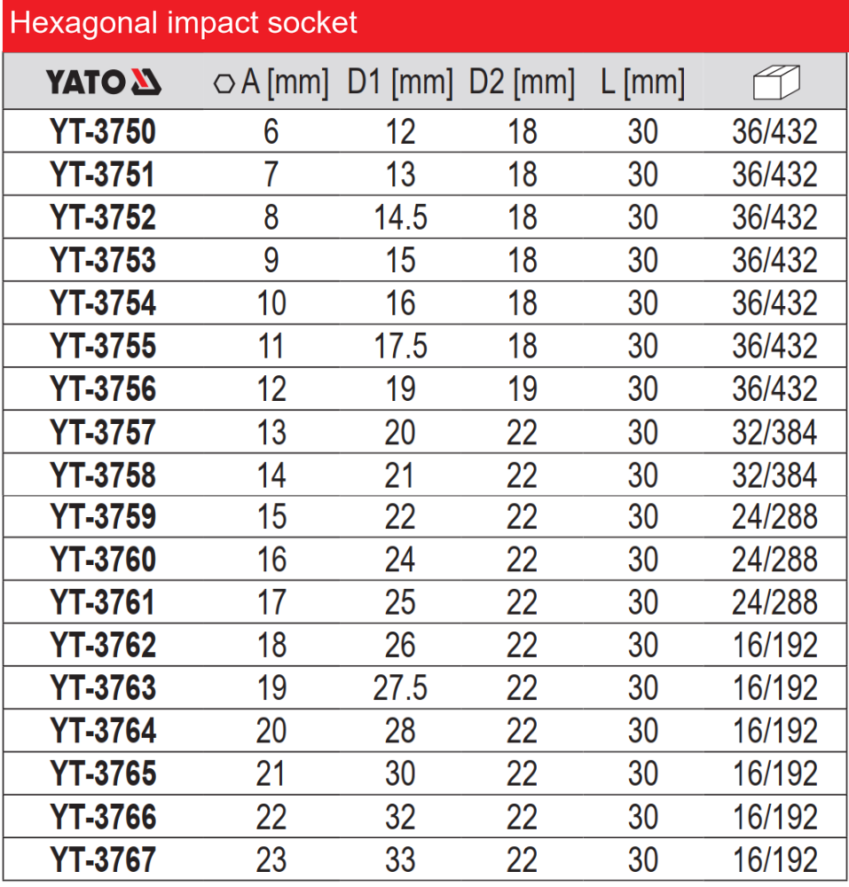3/8"x6x30mm Yato YT-3750六角ソケットの技術仕様: