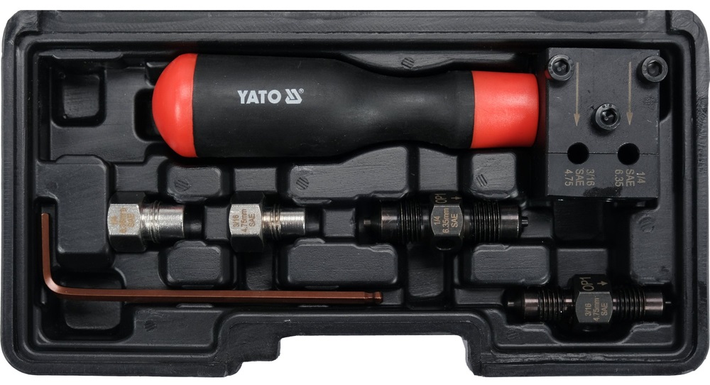 Yato YT-06086 brake hose pressing tool set is used to press all types of metal brake hoses, including: