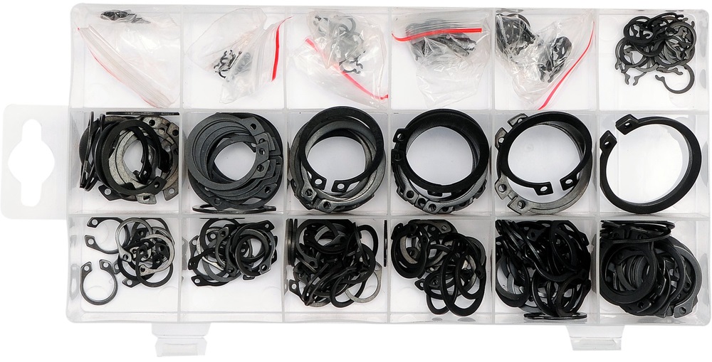 18 種類のサイズを備えた 300 個の Seger ストップ リングで、あらゆるニーズに対応します。