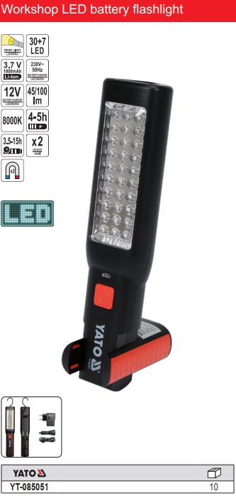 - Yato YT-085051 37球 100LM マグネット付きLEDリペアライトは、30+7個のLED球を使用し、強力で均一な光を生み出します。ランプには 2 つの照明モードがあります: 100% と懐中電灯。懐中電灯には 7 つの LED 電球があり、集中的に照明できます。