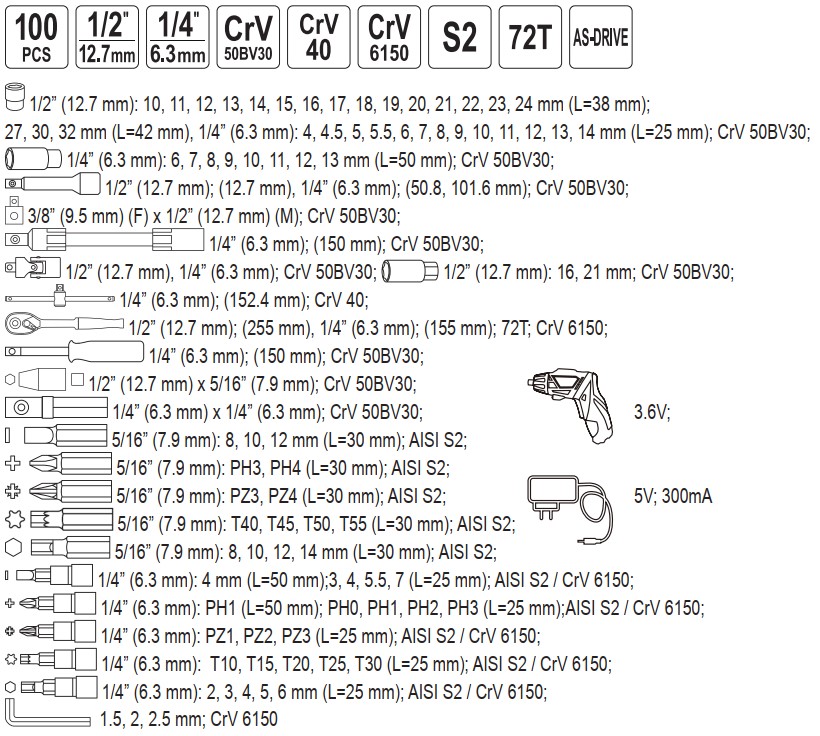 High quality, high durability: YATO YT-12685 tool set is manufactured according to European standards, ensuring high quality and durability. The tools are made from high-quality steel, thoroughly heat-treated and tempered, with high hardness and strong impact resistance.