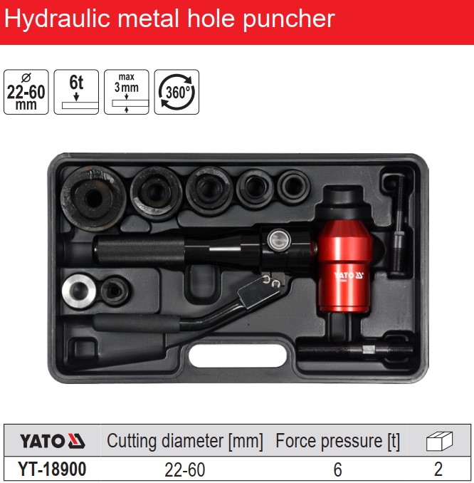 油圧シートメタル穴あけツール 22-60mm 6T YATO YT-18900 – あらゆる正確な穴切り作業のためのコンパクトなソリューション