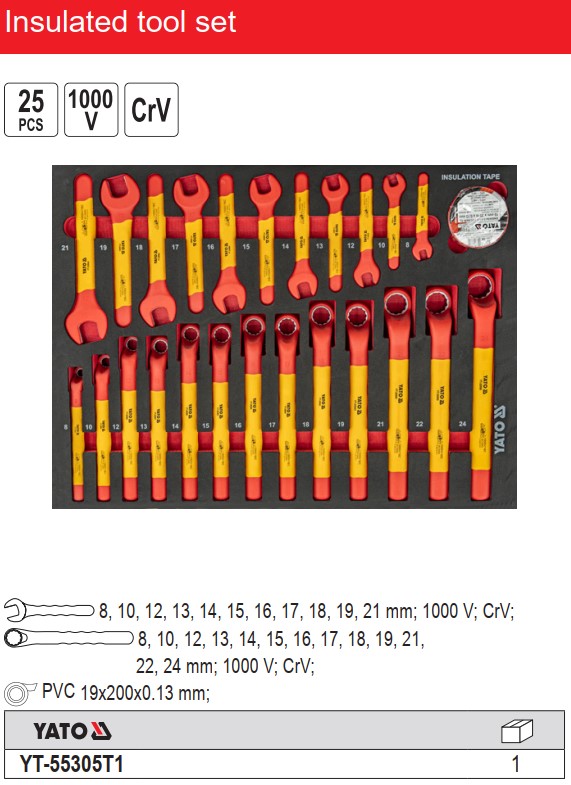 Have you ever worried about working with high-voltage equipment when your tools aren 't sufficiently insulated, leading to the risk of electric shock or short circuits? With the Insulated Wrench Tray 25 Pieces Yato YT-55305T1, all your electrical safety concerns will be thoroughly addressed – this is an essential toolkit for every modern electrical engineer 's toolbox.