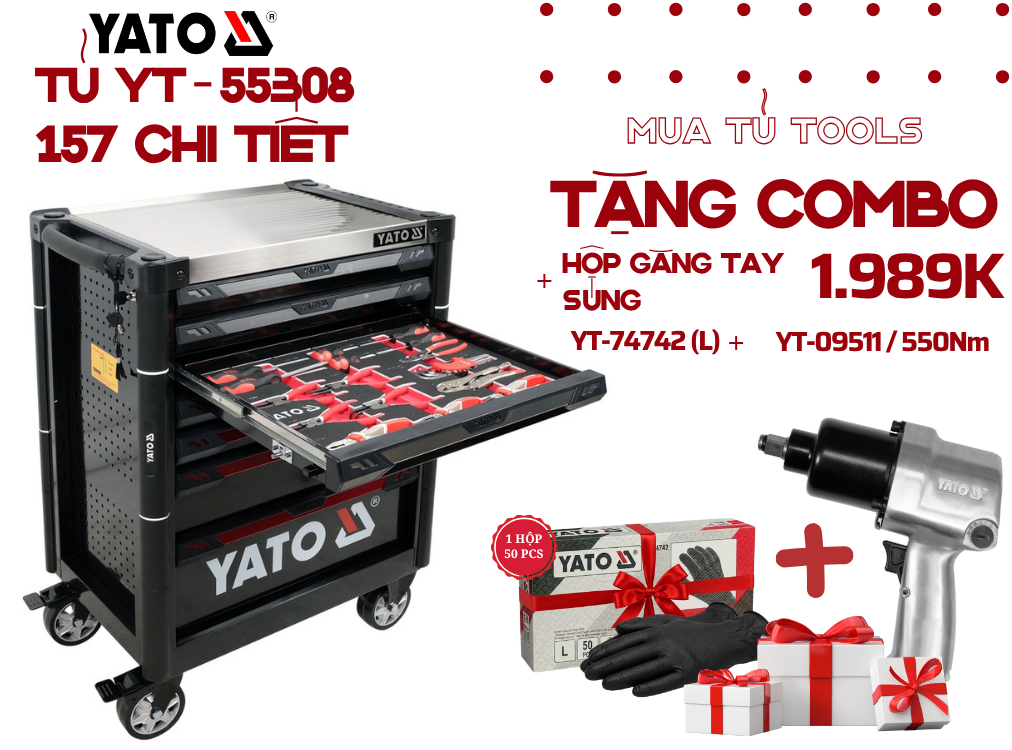 Khi sở hữu Tủ đồ nghề DIY 157 chi tiết Yato YT-55308, quý khách sẽ được tặng ngay một combo quà tặng cao cấp gồm: