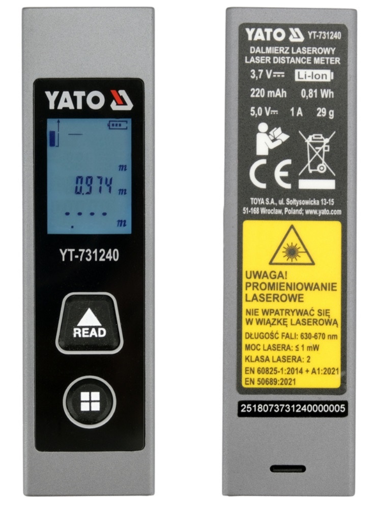 YT-731240은 TOYA S.A. (EU)에서 개발한 Yato 브랜드의 포켓 사이즈 레이저 거리 측정기입니다. 손가락 끝 크기의 디자인으로, 실내 공간, 설치 및 건설 마무리에서 빠르고 정확한 측정에 이상적입니다.