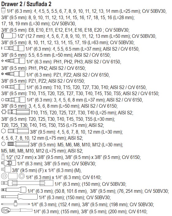 - 超硬CrV鋼: すべてのソケットとレンチはCrV6150/50BV30鋼で作られており、優れた強度と高い耐摩耗性を提供します。